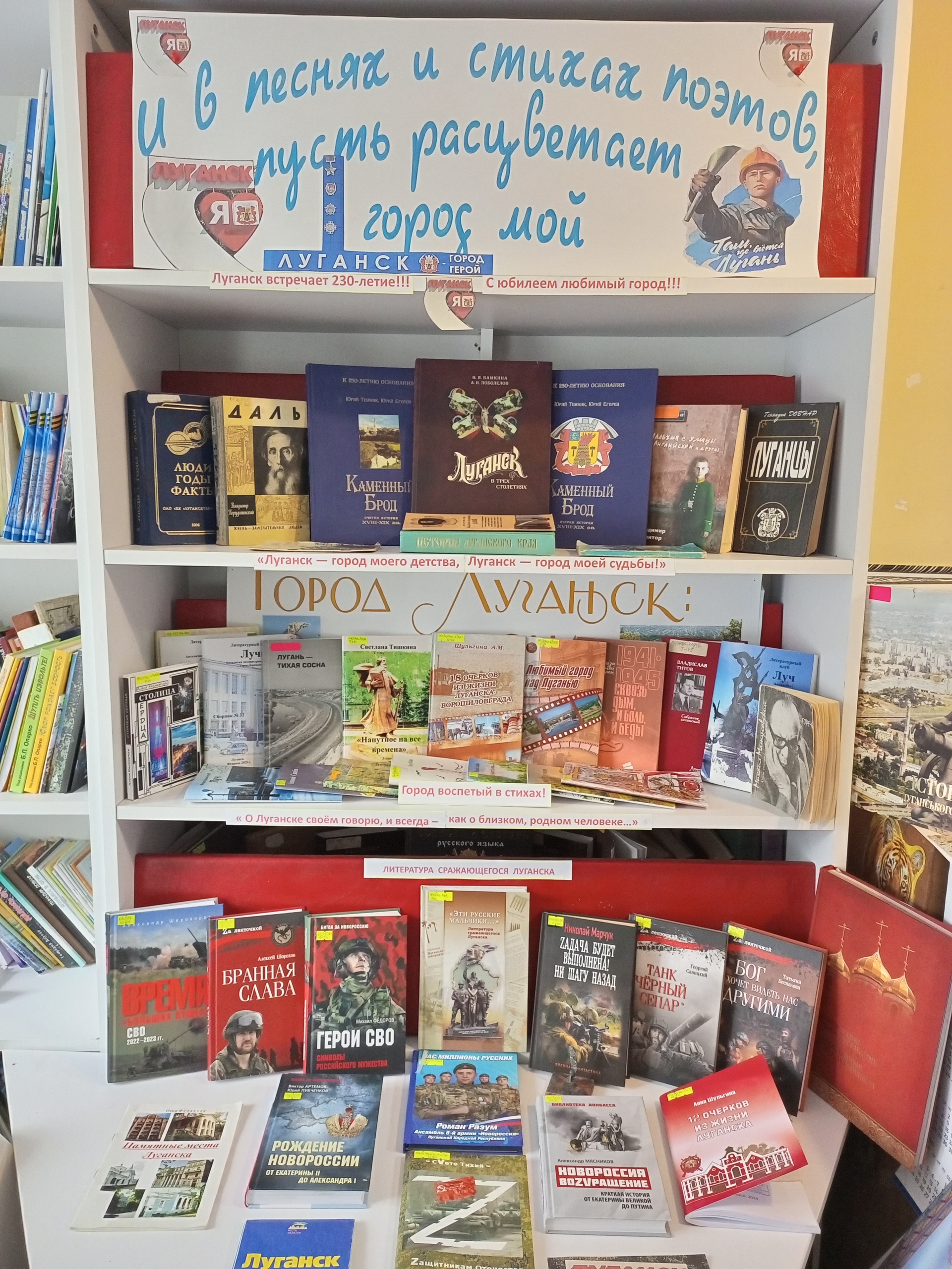 В начале сентября наш любимый город Луганск отмечает юбилей – 230 лет! Это не просто дата в календаре, это повод вспомнить славное прошлое, отпраздновать яркое настоящее и вместе создать незабываемое будущее нашего города! К юбилейной дате в библиотеке-филиал №4 подготовлена книжная выставка «И в песнях и в стихах поэтов, пусть расцветает город мой». Из книг представленных на выставке вы можете узнать историю нашего города, познакомиться с книгами поэтов и писателей, литературные произведения, которых посвящены жизни Луганска и луганчан. Выставка рассказывает также и о знаменитых людях, которые жили и работали в нашем городе. Ведь Луганск для многих из нас — это город детства и город нашей судьбы!