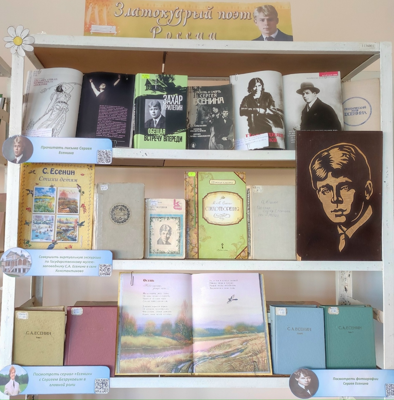 К 130-летию русского поэта Сергея Есенина сотрудники библиотеки-филиала №9 оформили книжную выставку-портрет «Златокудрый поэт России». На выставке вы найдете книги и периодические издания о жизни и творчестве поэта. И также волнующие душу и сердце стихотворения Сергея Есенина. Воспользовавшись телефон, по QR-коду, вы сможете совершить виртуальную экскурсию по Государственному музею-заповеднику С.А. Есенина, просмотреть фотографии и письма поэта, а также насладиться просмотром многосерийного фильма «Есенин». Приглашаем всех посетить нашу книжную выставку!